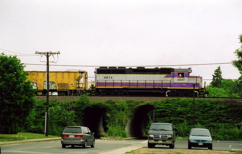 Here 3247 is pushing a work train north on the Lowell (New Hampshire Main) Line at Innerbelt Road in Somerville on June 28, 2005