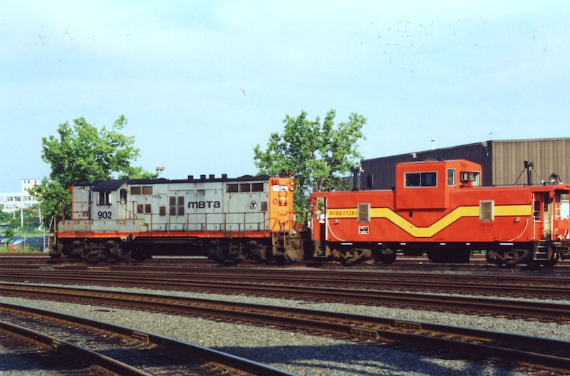 GP9 #902 and the MBTA's only caboose, # C-1 Work Extra, parked on a siding at BET. (Summer 2004)