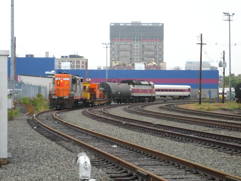 Caption: Another view of the washer train. The two tracks on the left are normally used by the T for storing MOW equipment. The next track over is the Grand Junction Branch. The last track is a Pan-Am track that loops around and connects with the Lowell Line. (October 12, 2006)