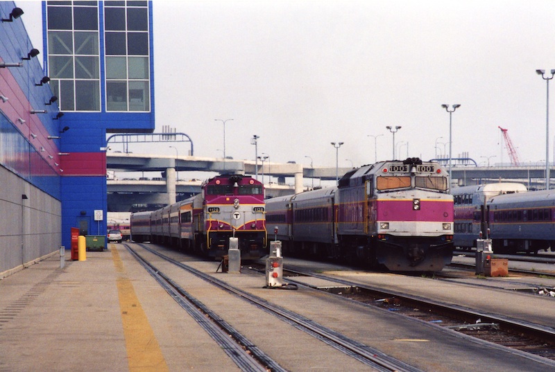 1128 and 1001 parked below Tower H in Yard 14. Due to noise complaints from a nearby condominium complex a few years ago, engines are not allowed to idle at the layover facility. (Summer 2004)