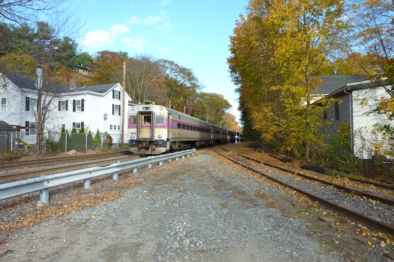 Control car 1643 brings up the markers on Train #1113 as it leaves Manchester-By-The-Sea. (October 31, 2009)