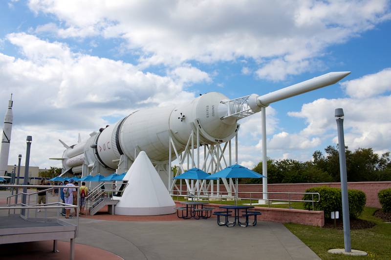 Caption: The top of the Saturn IB. The Service Module (with the four-way thruster mounted on the side) is a mockup installed in 1994 after the original rusted out; the Command Module mounted "above" that is actually the Apollo Facilities Verification Vehicle, a so-called boilerplate spacecraft meant to test certain systems without the expense of building a fully-functional vehicle. (March 15, 2011)