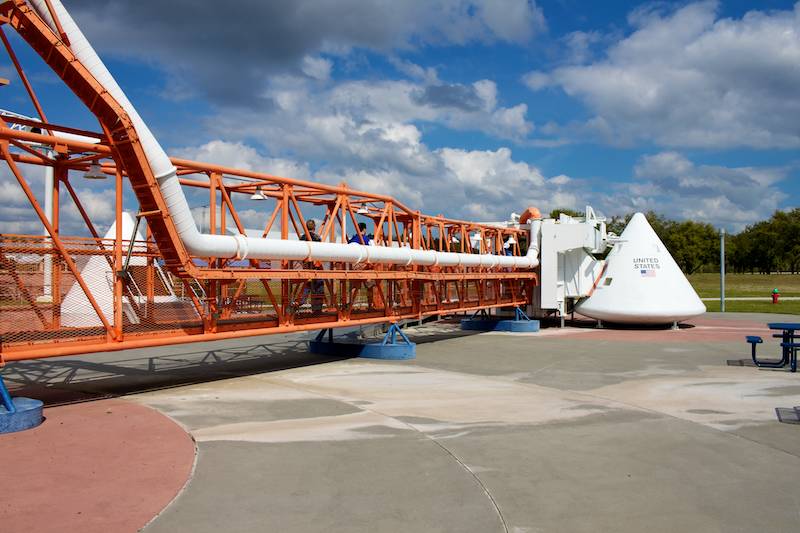 A mockup Apollo capsule waits at the end of the actual service arm used for the Apollo 11 launch. (March 15, 2011)