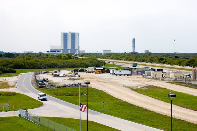 Looking west from the observation gantry towards the Vehicle Assembly Building. The tower to the right of the VAB is the mobile launch platform for the Ares I. (March 15, 2011)