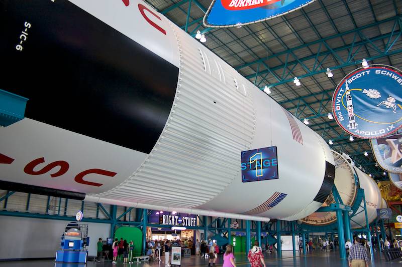 Caption: Looking up the first stage of the Saturn V. The rocket is painted like the one used for Apollo 11, complete with serial number S-IC-6; however, the first stage is actually unit S-IC-T, which was used for test firings on the ground. The second and third stages were intended for the cancelled Apollo 19 mission. (March 15, 2011)