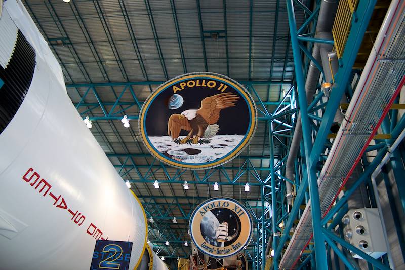 Insigniae from the Apollo missions hang from the ceiling of the Apollo/Saturn V Center. (March 15, 2011)