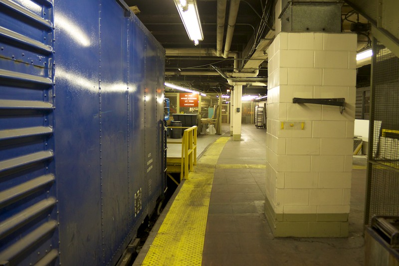 Caption: Track 101 was one of the lower-level loop tracks, allowing locomotive-hauled trains to quickly turn around in the days before push-pull operations began. Subsequent modifications have made such moves impossible (at least on this track), although the rails themselves appear to be intact beneath the newer floor. (October 11, 2010)