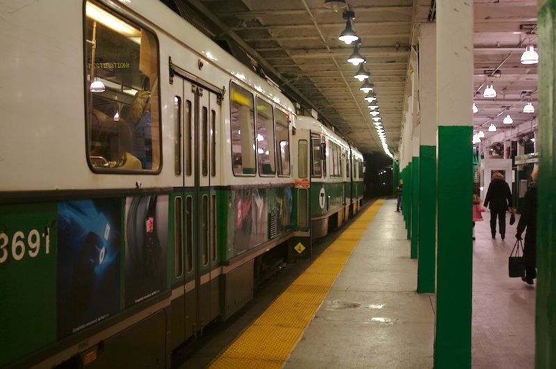Riverside-bound Type 7s 3677 and 3691 prepare to leave Boylston. (December 27, 2006)