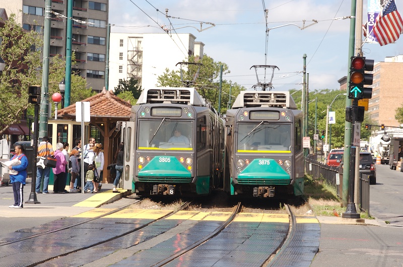 Two trains pass on the inbound side of Coolidge Corner. The inbound train is on the left. (June 15, 2007)