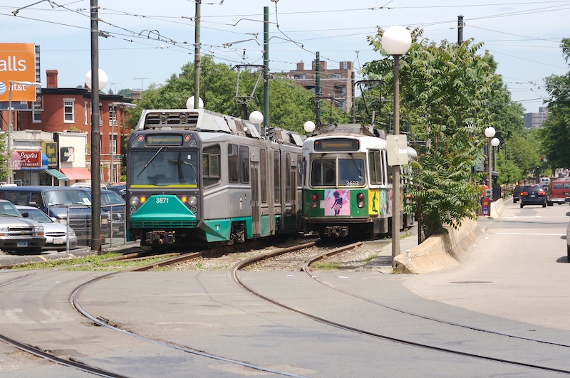 Caption: There's two carlengths' worth of space between Cleveland Circle and the C line platforms, which are used to layover trains. Trains on the outbound track (the left one) can either loop through Reservoir Carhouse or reverse direction through a crossover onto the inbound track. (June 15, 2007)