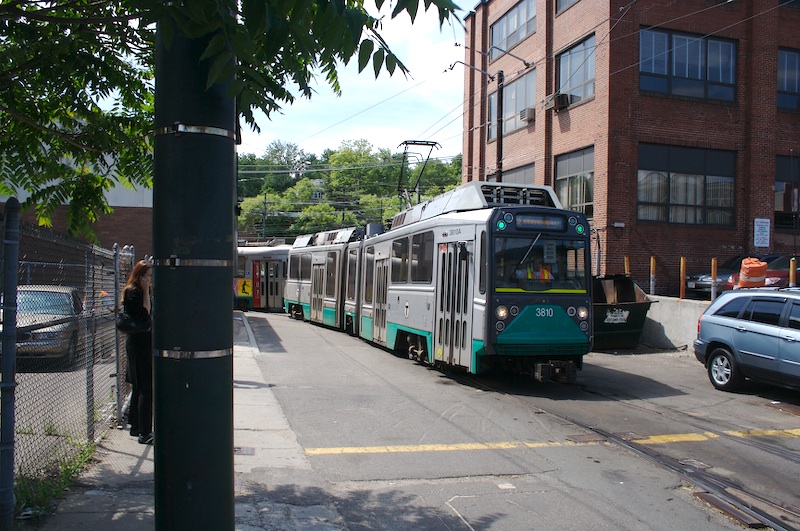 Caption: 3810 pulls out of Reservoir on Prendergast Ave for another inbound run to North Station. From this track trains can go to either the inbound or outbound C line tracks; from the latter, they normally go up Chestnut Hill Avenue to the B line. (June 15, 2007)