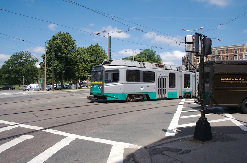 Caption: 3880 going through Cleveland Circle on its way into Reservoir yard. The tracks here form a three-way intersection, with track coming in from the C line, Reservoir Carhouse/D line, and the B line. Trains can head in any direction except those coming from the B line, which can only head to Reservoir Carhouse or the D line. (June 15, 2007)