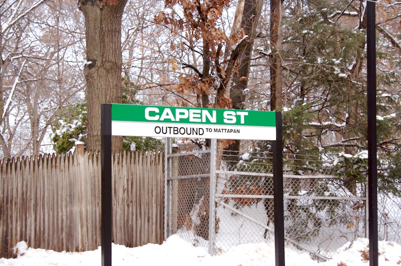 Caption: The new station signs are green. This is the first time in decades that there has been a public indication that the line is part of the Green Line, not the Red Line (operating crews are drawn from the Green Line, and most maintenance is performed at Riverside). (December 22, 2007)