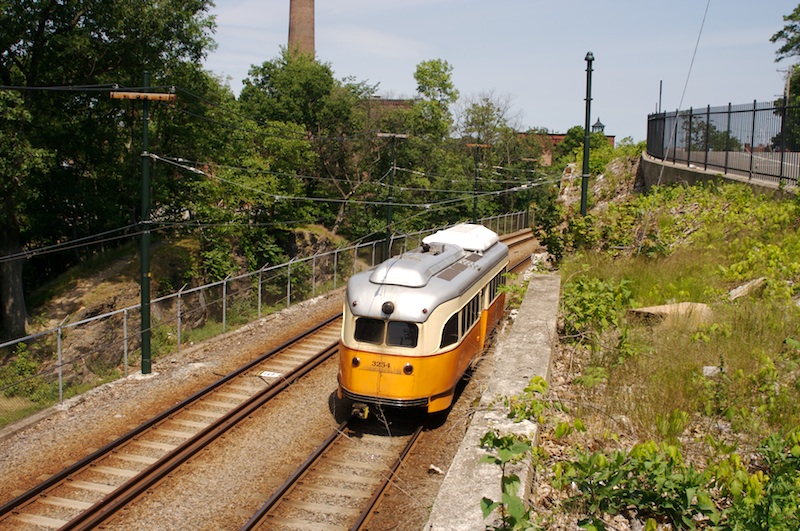 The T's brush cutting late in 2008 opened up some photo opportunities along Eliot St between Central Avenue and Milton stations. 3254 heads inbound past the rock outcropping where I've taken pictures before. (June 8, 2009)