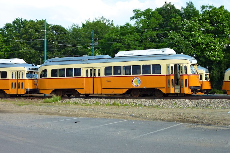 Caption: 3265 sits on the ramp track at Mattapan used for rolling cars on and off trucks for transport to Riverside. A close inpection reveals that the front rollsign is papered over, the headlight is missing, and the track brakes are missing from the trucks. 3265 has been derelict for several months. (June 5, 2010)