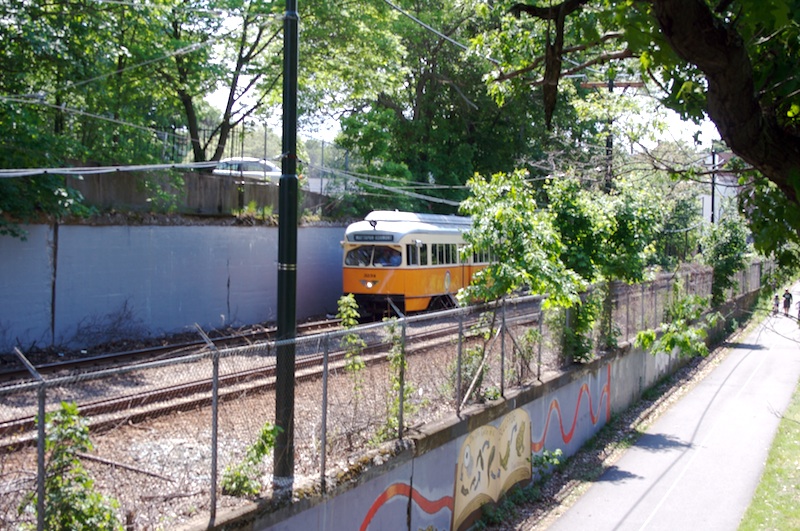 Caption: 3234 heads up the hill between Central Ave and Milton after leaving the former. The bike path is on the right-of-way of the New Haven's Milton Branch, which it retained as a spur to serve the Baker Chocolate Factory after the Shawmut Branch and the rest of the Milton Branch were transferred to the Boston Transit Department for conversion into the Dorchester Extension of the Red Lien and the Mattapan High Speed Trolley. Conrail abandoned service in the 1980's when the chocolate factory closed down, and the ROW was converted to a bike path in the early 2000's. (June 1, 2008)