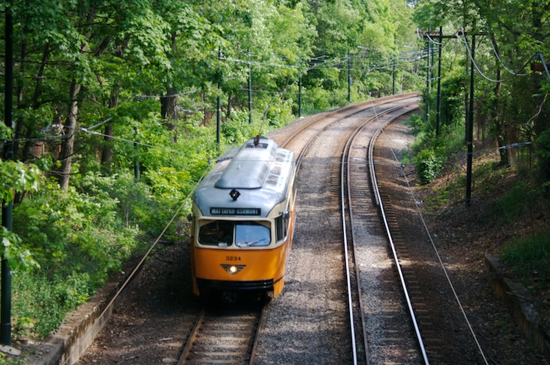 3234 is about to go under the bridge connecting the two halves of the cemetary. (June 1, 2008)