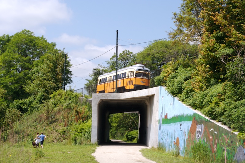 Caption: 3268 passes over the rail trail before cutting through Cedar Grove Cemetary on its way towards Ashmont. The Milton Branch split in two here, with one track going under the Mattapan Line to serve the chocolate factory and the other passing to the left to serve a warehouse. A few hundred feet of track of the latter remain between Buter and the Neponset River. (June 17, 2008)