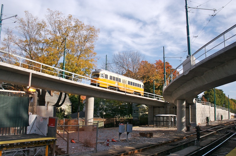 Caption: 3254 arriving at Ashmont. The viaduct it's on is similar in design to the one supporting the northbound Green Line track at North Station, but is of a lighter construction. The T may yet regret that decision decades from now if they ever have to replace the PCCs with heavier vehicles. (October 14, 2008)