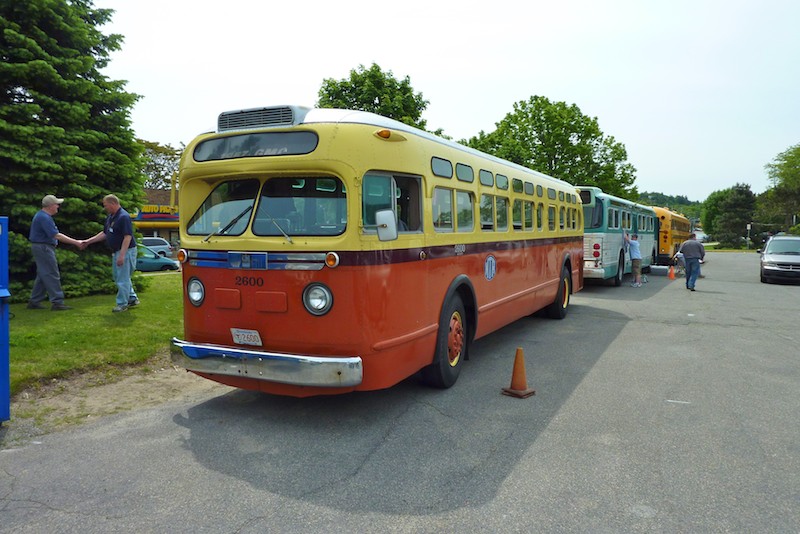 Caption: 2600 is a GMC TDH-4512 coach built in 1957 for the Eastern Massachusetts Street Railway as their #3183. After the MBTA absorbed the Eastern Mass in 1968, it was renumbered 2600 and ran until 1970. In 1989 it was rescued from the scrap line and restored at Everett Shops. Strangely, they decided to paint it in MTA colors, although it never operated for the MTA. (May 22, 2010)