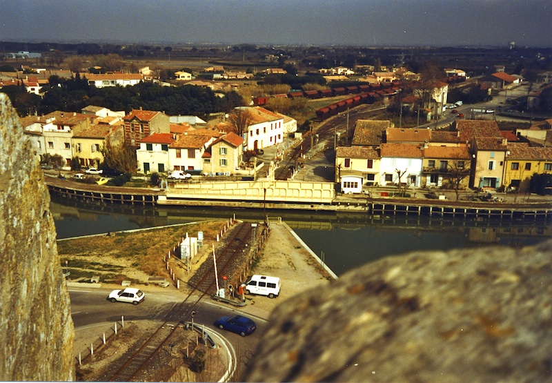 A curious swing-bridge north of the Constance Tower in Aigues Mortes. In the open position (shown) it's part of a walkway, in the closed position it's a railroad bridge. (March 7, 2000)