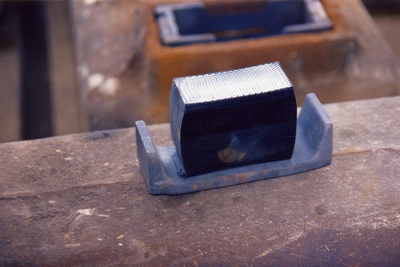 Caption: GATX is gradually replacing the bolster bearings on its cars with new constant-contact bearings. The bearings on most cars are just blocks of steel, which do not make constant contact with the frame of the car, resulting in the car rocking from side to side. Constant-contact bearings have a core made of a rubber composite that compresses when the car is lowered onto its trucks, making constant contact. This reduces the car's tendency to sway.