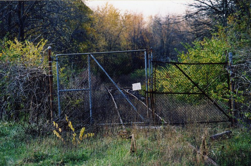 Caption: The southern end of the yard has been abandoned, although the tracks remain. This gate is at the intersection between Beech St. and Lost Creek Rd, where the connecting track to the Pennsylvania RR's Vandalia line left the yard. The connecting track and the Vandalia line have both been abandoned for years. This photo is from fall 2003.