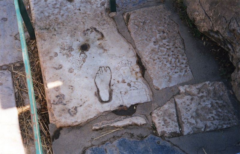 This picture engraved on the Marble Way between the theater and Library of Celsus points the way to a brothel. (June 24, 2002)