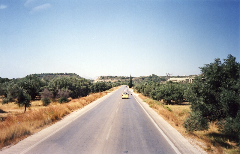 Driving down the east coast of Rhodes. We had a double-decker bus, so I was able to get shots out the front. (June 26, 2002)