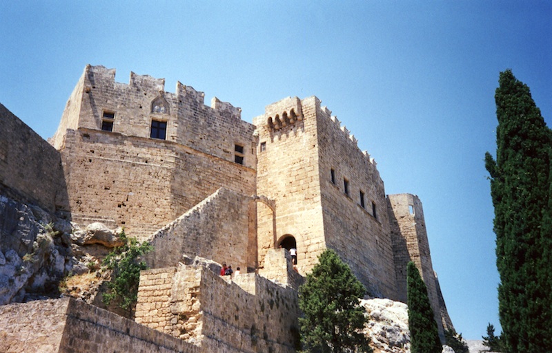 Looking up towards the acropolis at Lindos and the medieval Knights' Castle that dominates it. (June 26, 2002)