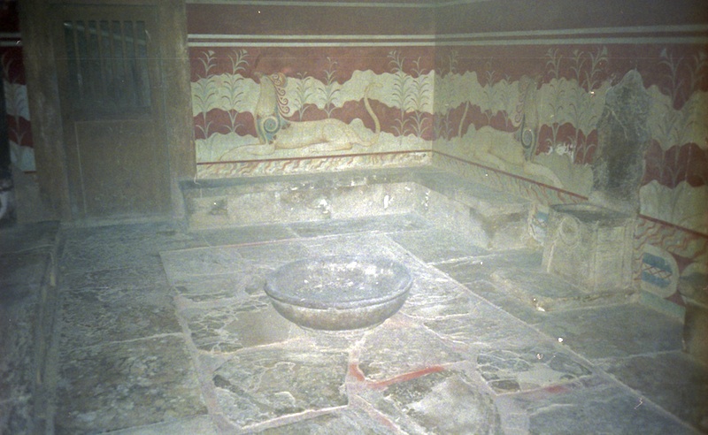 Throne room, with Minos' throne on the right and frescoes of griffins. (June 27, 2002)