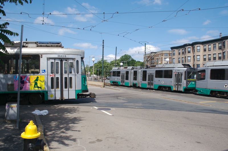 Type 7 #3643 pulls out of Reservoir and heads across Beacon Street to the inbound boarding platform at Cleveland Circle, while the Type 8s on the right head to the layover track after an outbound run. (June 15, 2007)