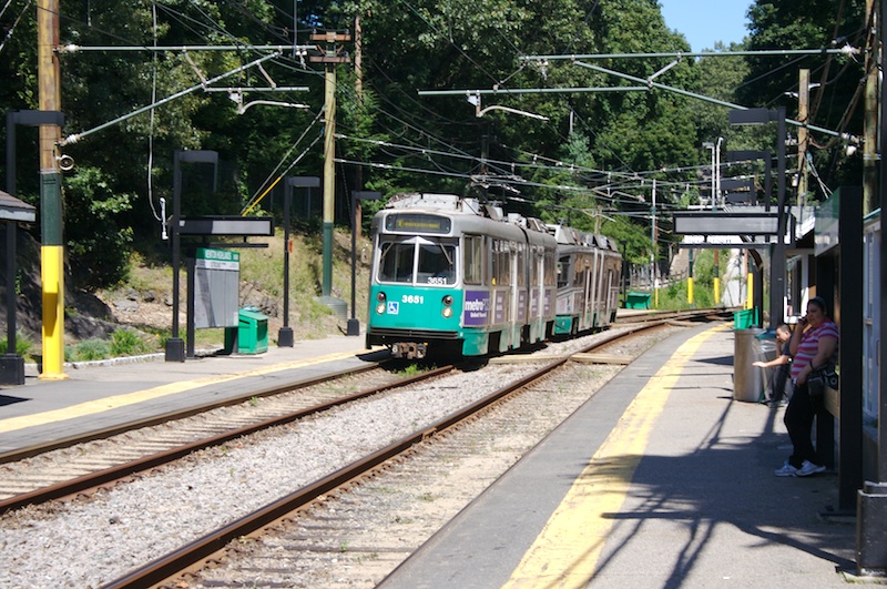 An outbound train lead by 3651 arrives at Newton Highlands. (September 6, 2009)