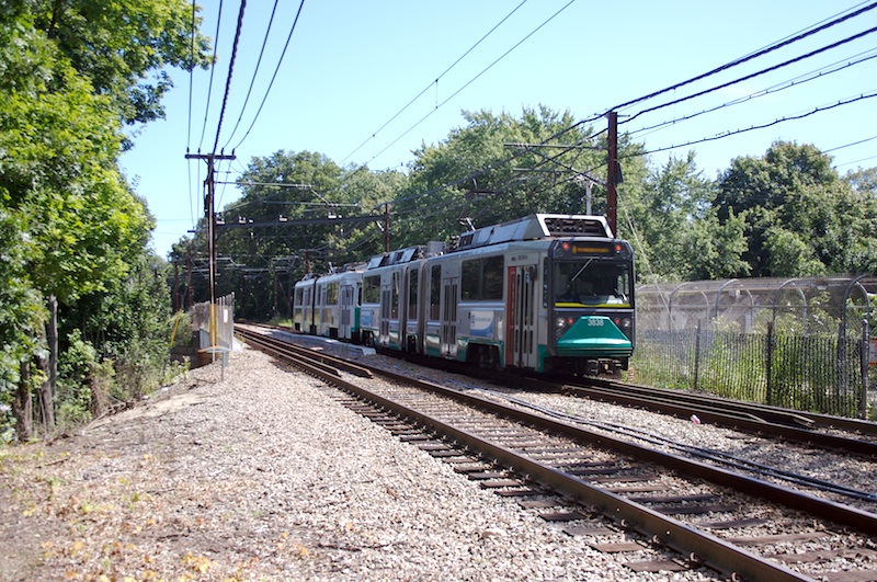 An inbound train with 3708 and 3838 crosses over Route 9 immediately after leaving Eliot. (September 6, 2009)