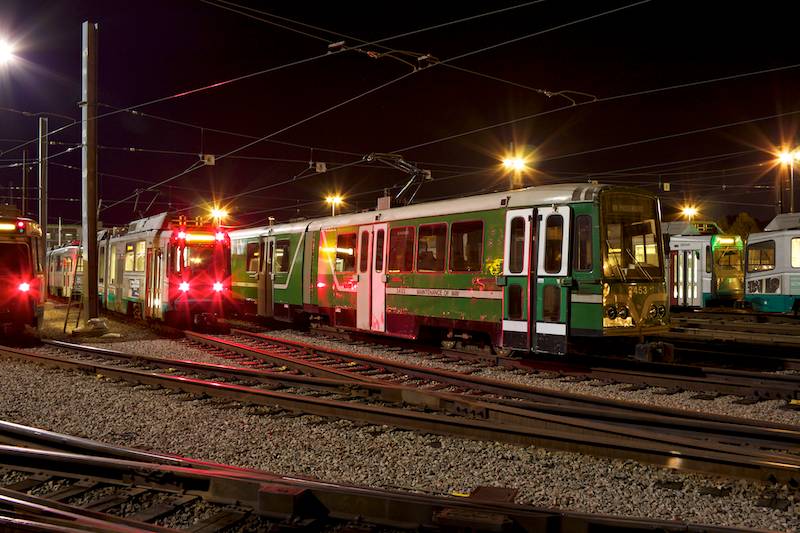 The lights reflecting off 3453's side make it look like a party trolley. The front doors on it must have been salvaged from another LRV a few years after it was converted for MOW service. (October 26, 2011)