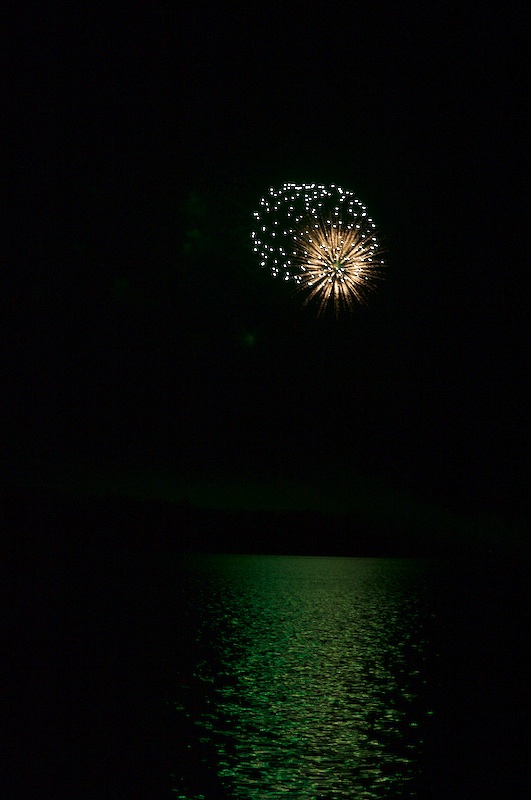 Caption: Greensboro's town fireworks were held on Friday, July 6. The fireworks are launched from a field just south of the lake, so we have to go out onto our dock to see them (the eastern shore of the lake, where we are, runs north-south). I got a few good shots of the fireworks reflecting on the lake. (July 6, 2007)