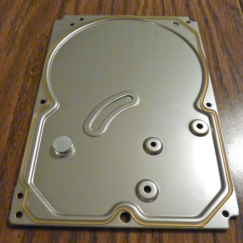 Caption: The underside of the drive's top panel. The whitish circle on the left appears to be a small air filter for equalizing pressure between the interior and exterior of the drive. On the other side of the panel there is the hole labelled "Do not cover this hole". (January 1, 2010)