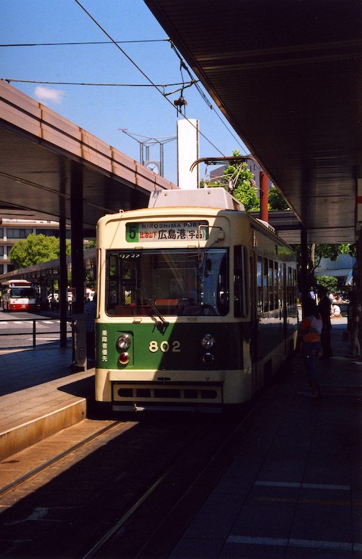 802 at Hiroshima-eki. Model 800 cars were built in 1983 and are identical to Model 700 cars. They also feature regenerative braking.