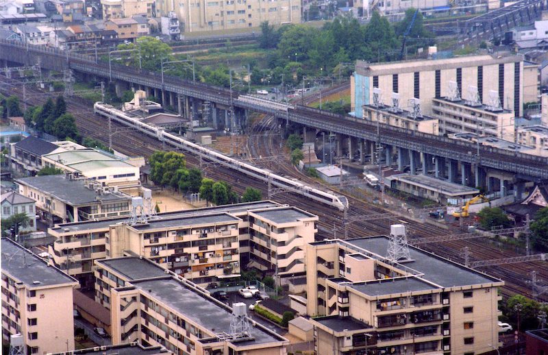 A westbound set of those EMUs with the elevated cabs arriving at Kyoto-eki.
