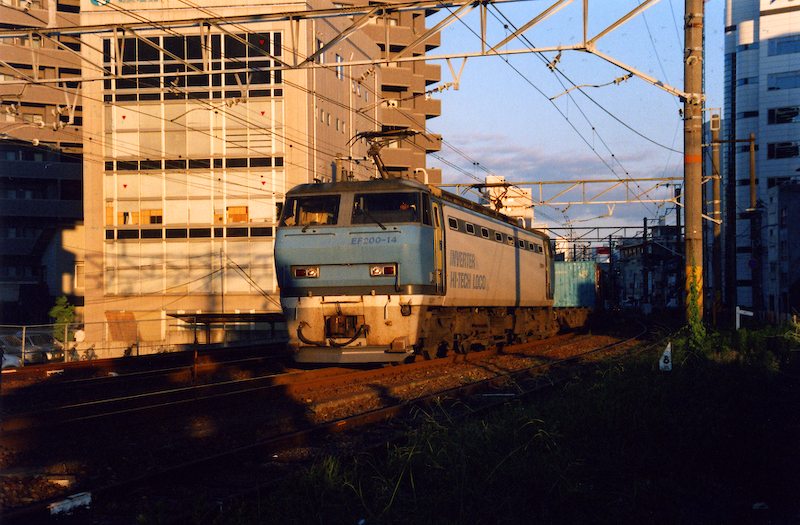 A westbound freight with a Class EF200 locomotive on the front.