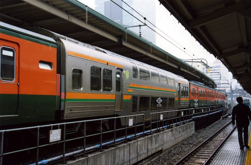 A bi-level Green (1st class) car on a train waiting to head south on the Tokaido main line.