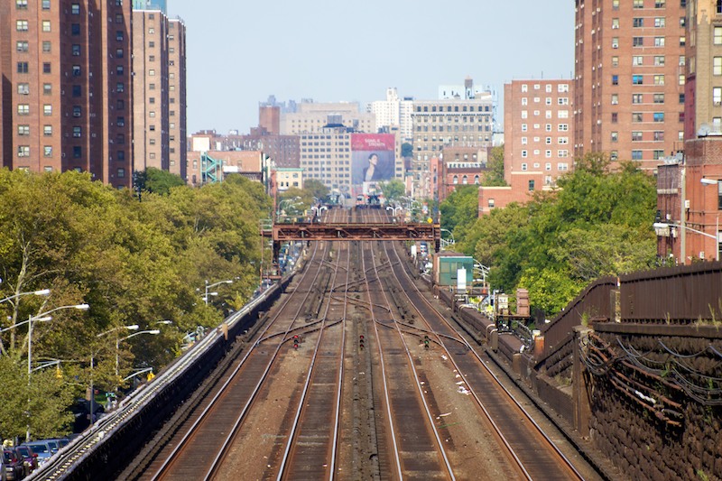 Caption: Looking north along the Park Avenue viaduct from the sidewalk just above the tunnel portal. In the distance can be seen a disused signal bridge and Harlem-125th St Station beyond that, with Train 1536 stopped at the station. (October 11, 2010)