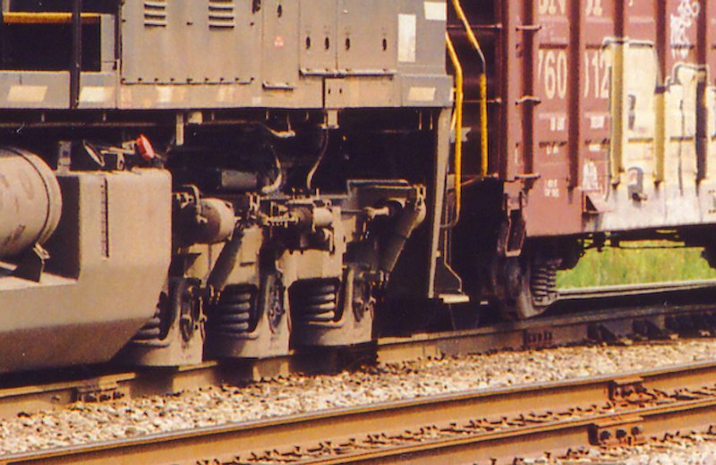 The front truck of 9237 and the first truck of the boxcar. (3 of 3)