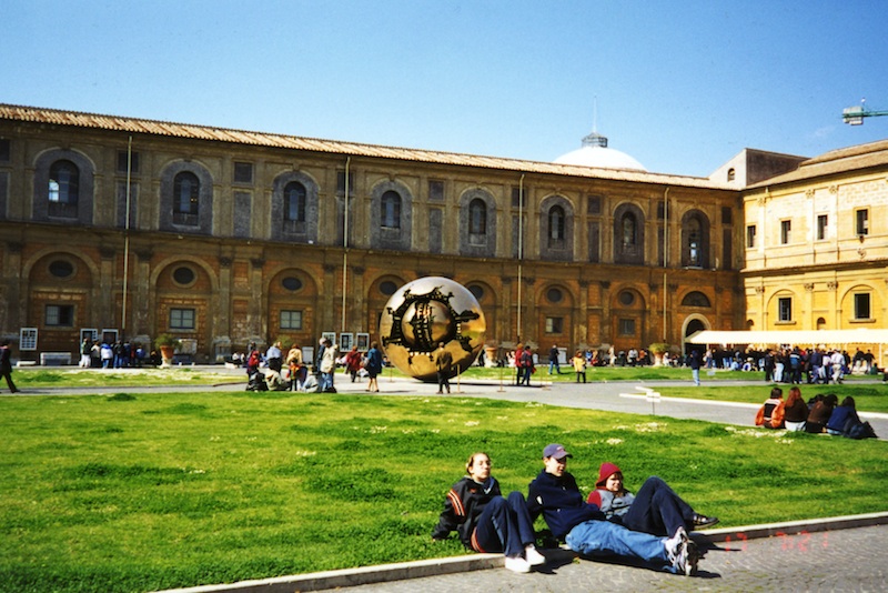 One of the courtyards in the Vatican, with a very odd bronze sculpture which is supposed to represent the modern world breaking out of the shell of the old world. (March 17, 1999)