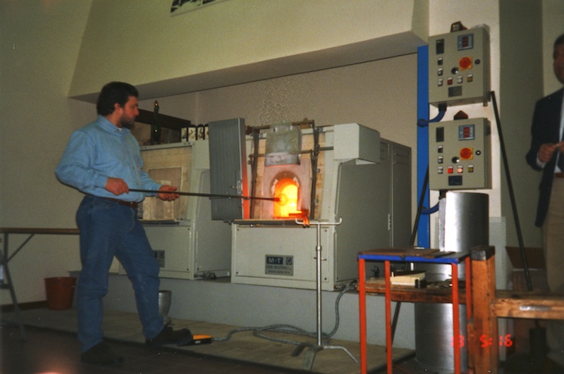 Our first stop in Venice was a Murano glass factory. Here a worker reheats a vase he's working on. (March 13, 1999)
