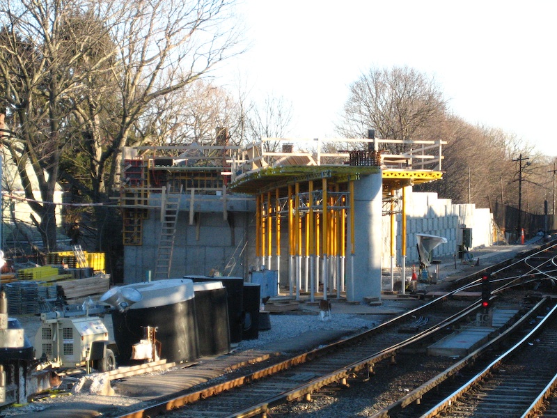 The ramp up to the new trolley loop is ready, and part of the construction framework of the bridge for the outbound track has been built in this shot from February 9, 2007.