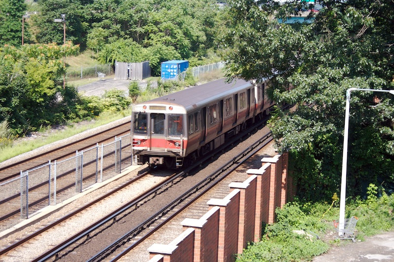 01877 leads an outbound train about to go under the Redfield Street Bridge. (August 25, 2009)