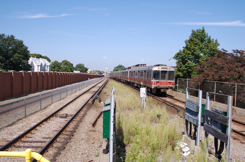 An inbound train departing from Wollaston. (September 4, 2009)