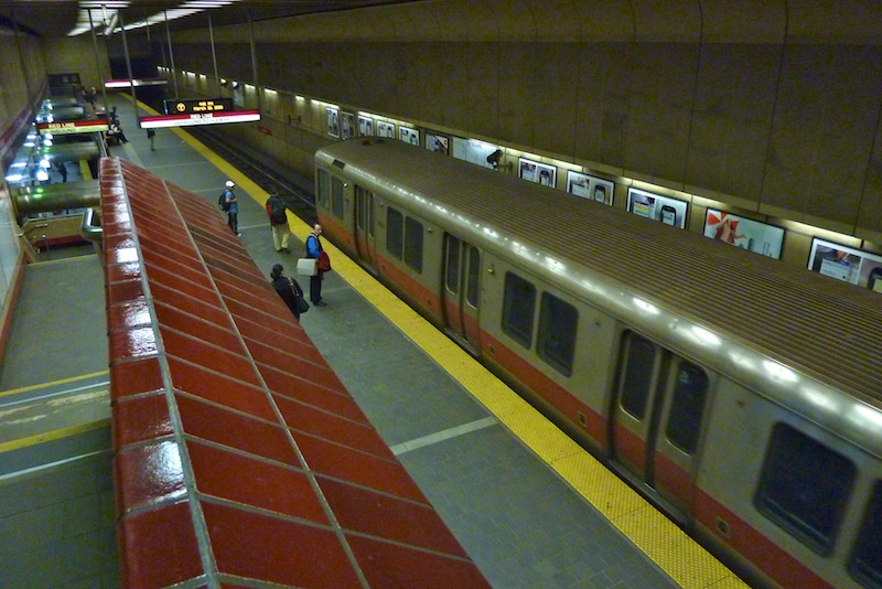 An outbound train to Alewife arrives at Harvard, viewed from the Church Street lobby. (March 18, 2010)