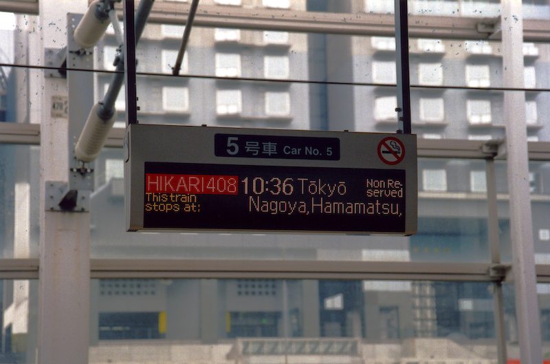 A destination sign, giving the train number, final destination, major intermediate stops, the car number, and whether the car is reserved or not. It flips every minute or so between Japanese and English.